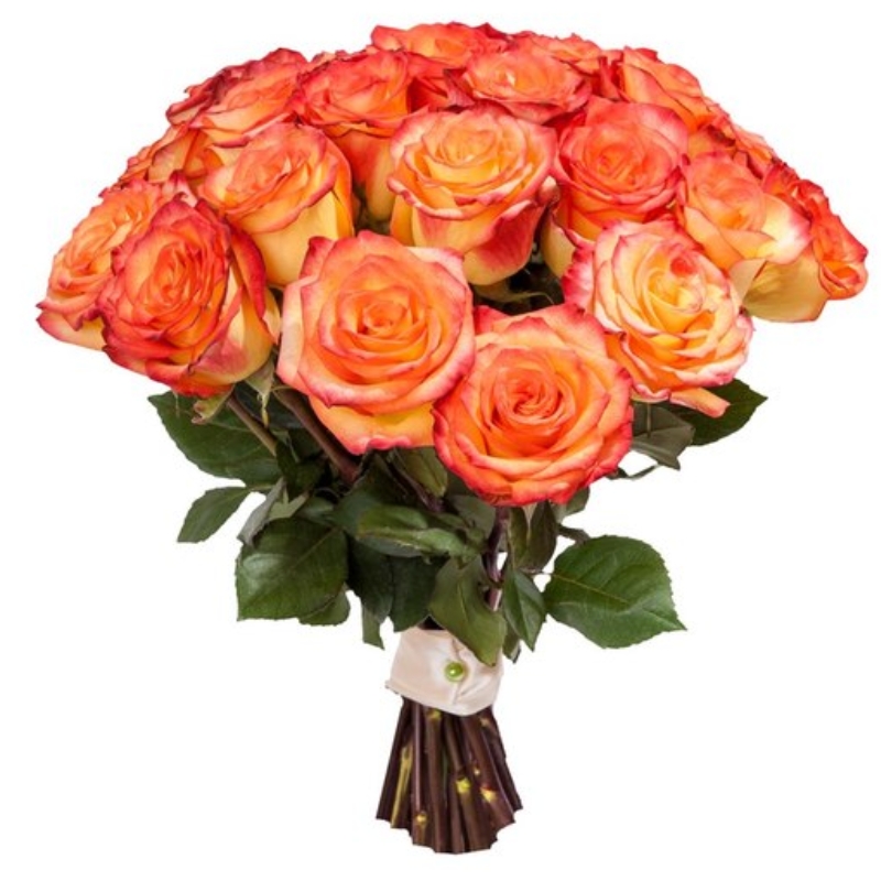 Букет состоит из 25 оранжевых роз, прозрачная упаковка, атласная лента.
