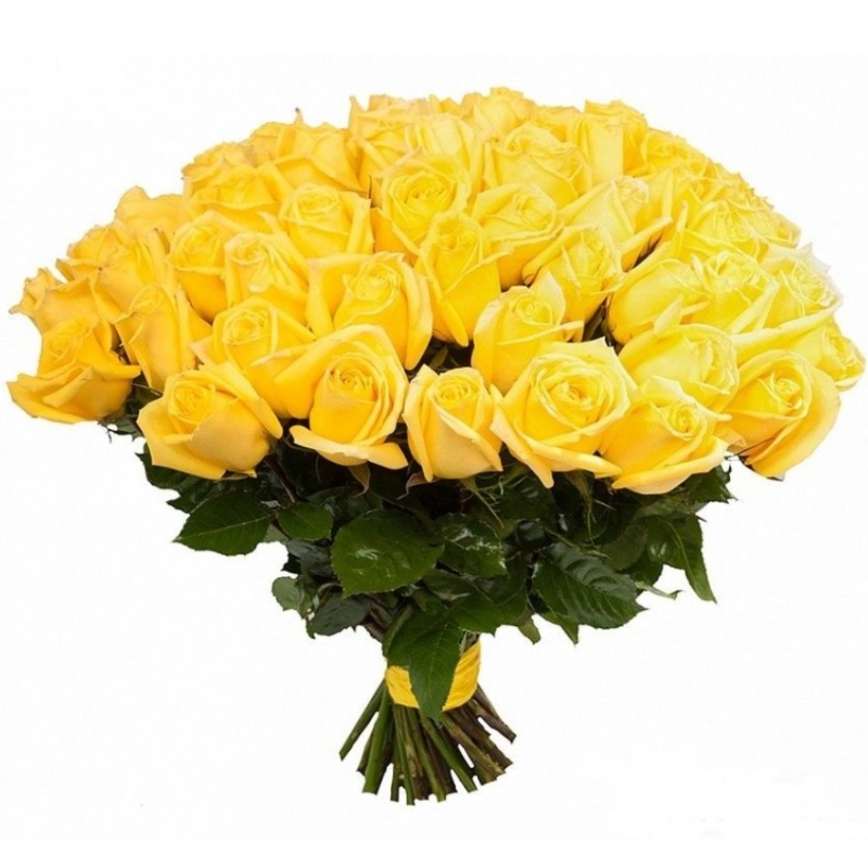 Букет состоит из 55 желтых роз, прозрачная упаковка, атласная лента.
