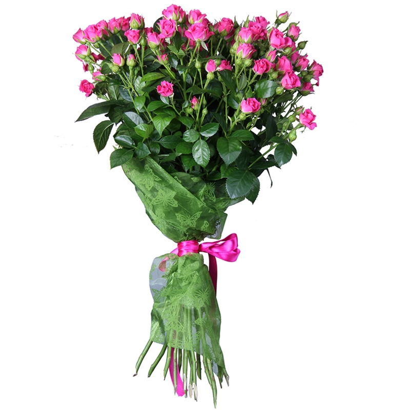 Букет состоит из 15 малиновых кустовых роз, красивая упаковка, атласная лента.