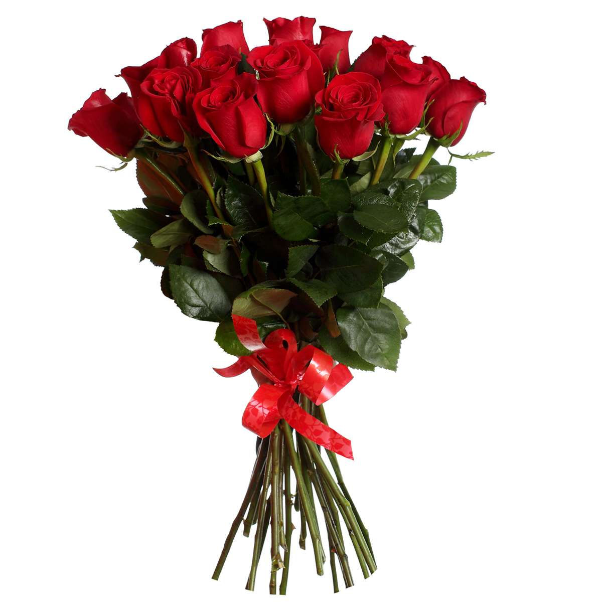 Букет состоит из 17 красных роз, лента.