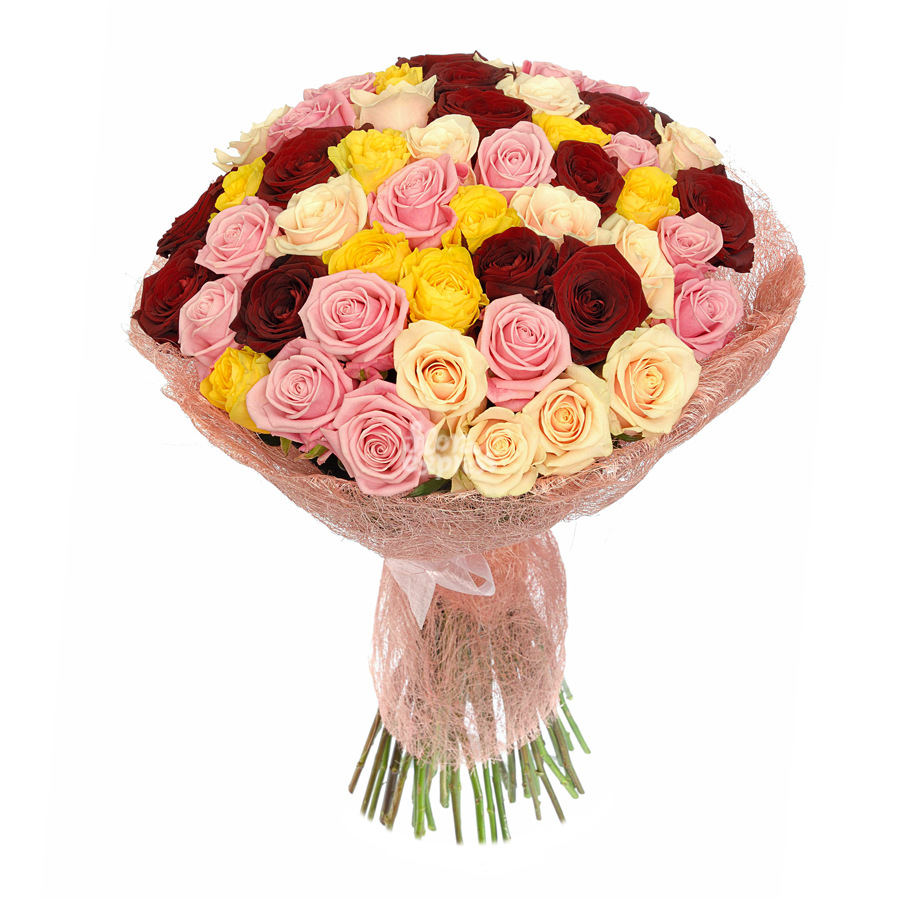 Букет состоит из MIX из 51 розы, красивая упаковка, атласная лента.