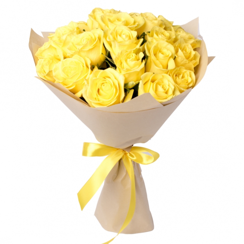 Букет состоит из 21 желтая роза, крафт, желтая лента.