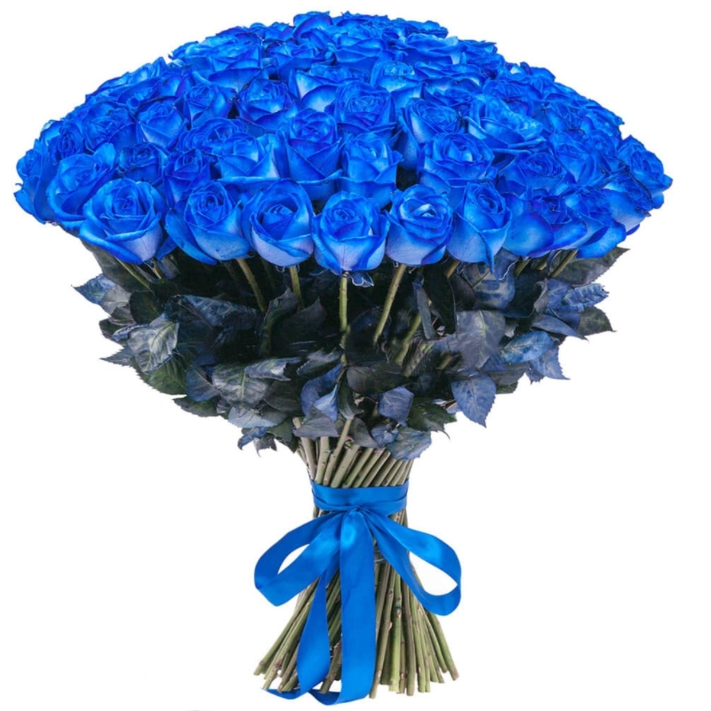 Букет состоит из 101 синяя роза, прозрачная упаковка, атласная лента.