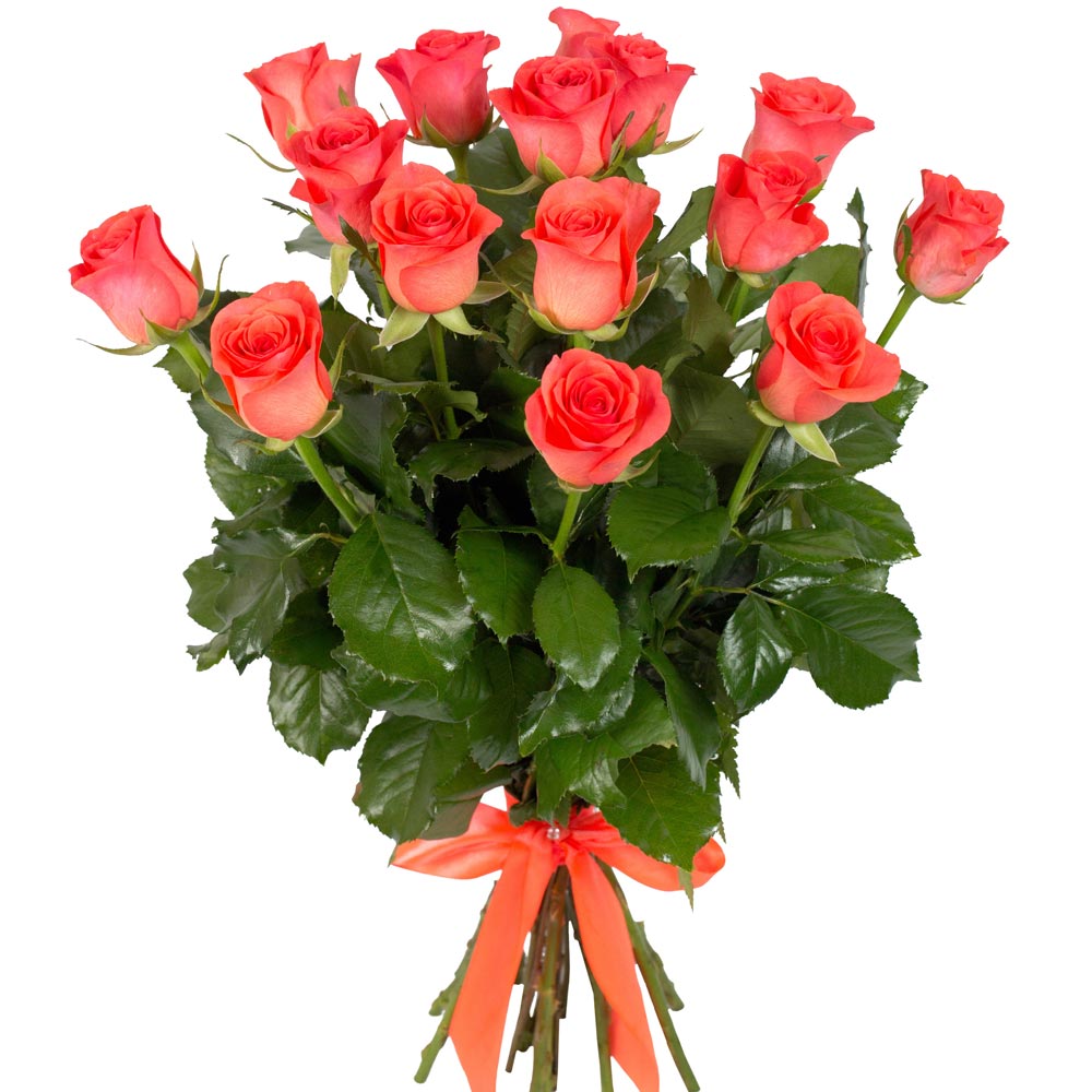 Букет состоит из 17 коралловых роз, лента.