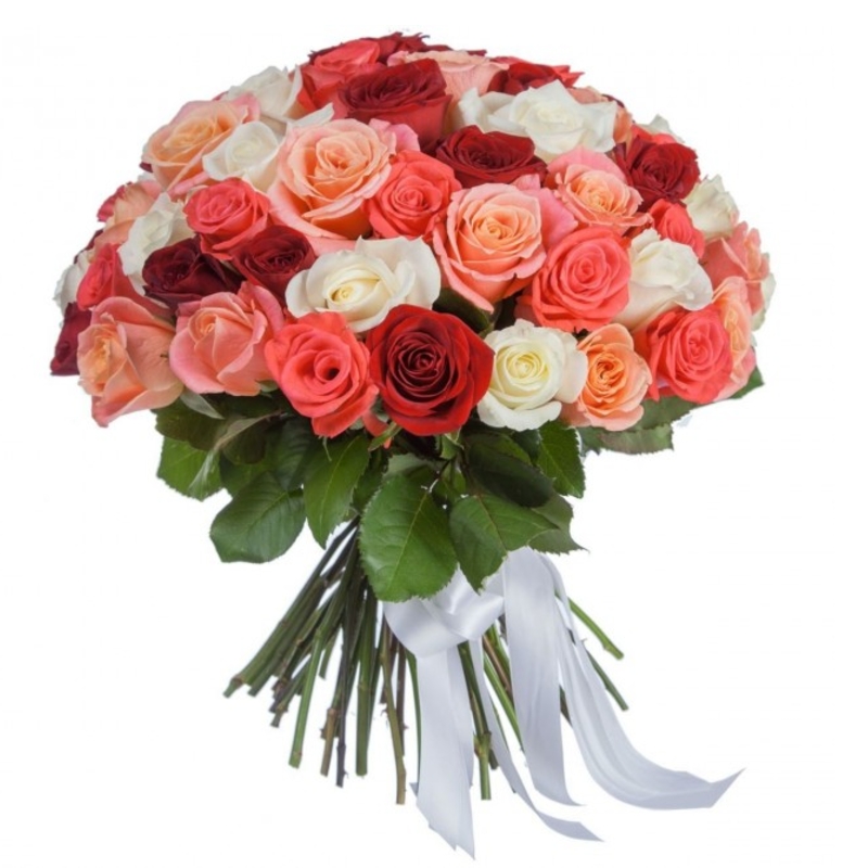 Букет состоит из MIX из 55 роз, прозрачная упаковка, атласная лента.