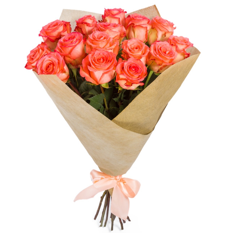 Букет из 15 коралловых роз в крафте