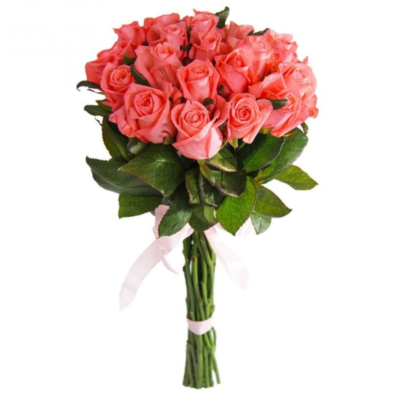 Букет состоит из 25 коралловых роз, прозрачная упаковка, атласная лента.