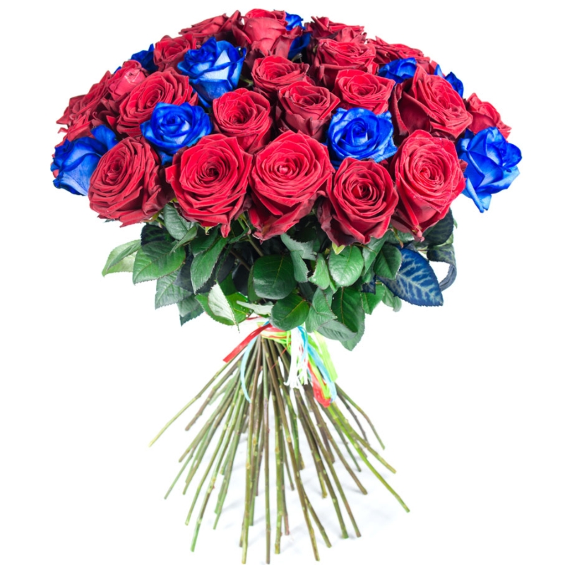 Букет состоит из 25 красных роз, 10 синих роз, прозрачная упаковка, лента.