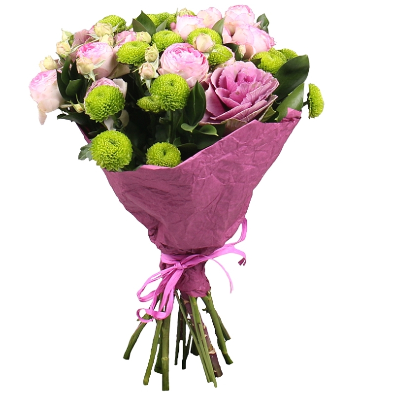 Букет состоит из 3 кустовые пионовидные розы, 3 ветки гвоздики, 2 цветка брассики, зелень, крафт, атласная лента.