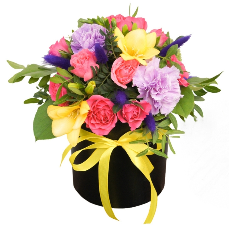 Букет состоит из 3 кустовые розы, 3 фрезии, 3 гвоздики, зелень, коробка, оазис, атласная лента.