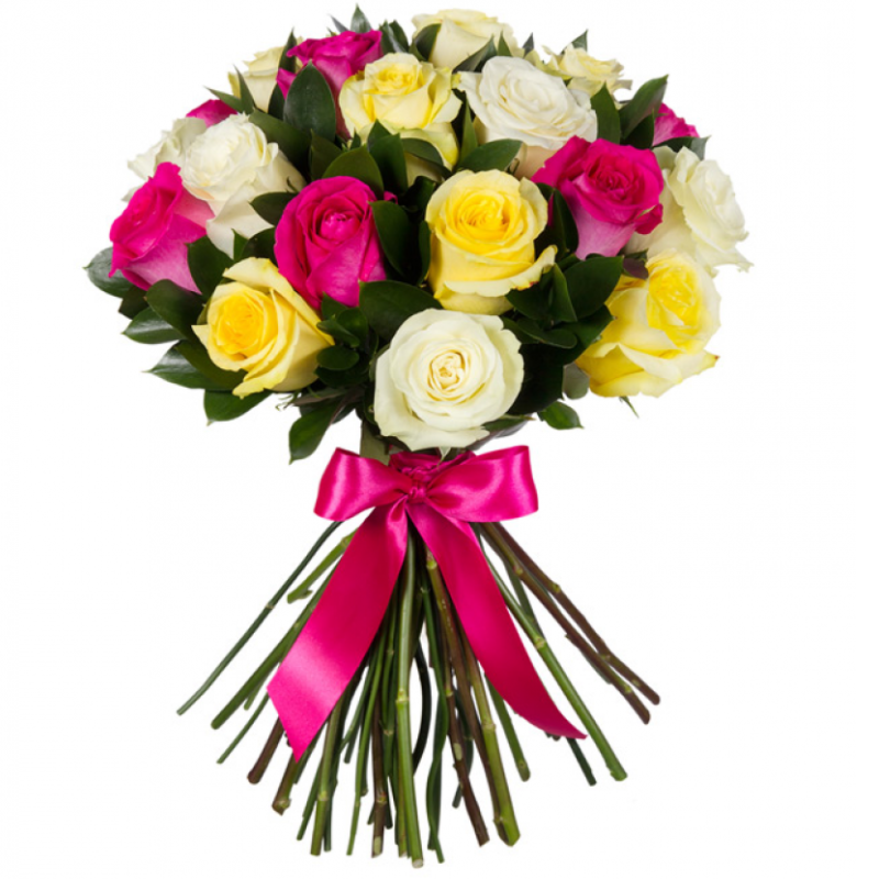 Букет состоит из MIX из 25 роз, зелень, прозрачная упаковка, атласная лента.