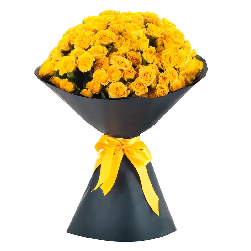 Букет состоит из 25 желтых кустовых роз, крафт, атласная лента.